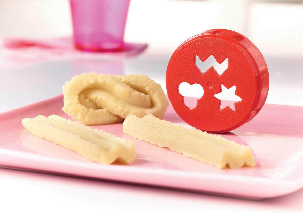 5. Använd FusionMaster Kvarn med kakinsatsen. Gör olika småkakor och lägg dem på bakunderlägget.